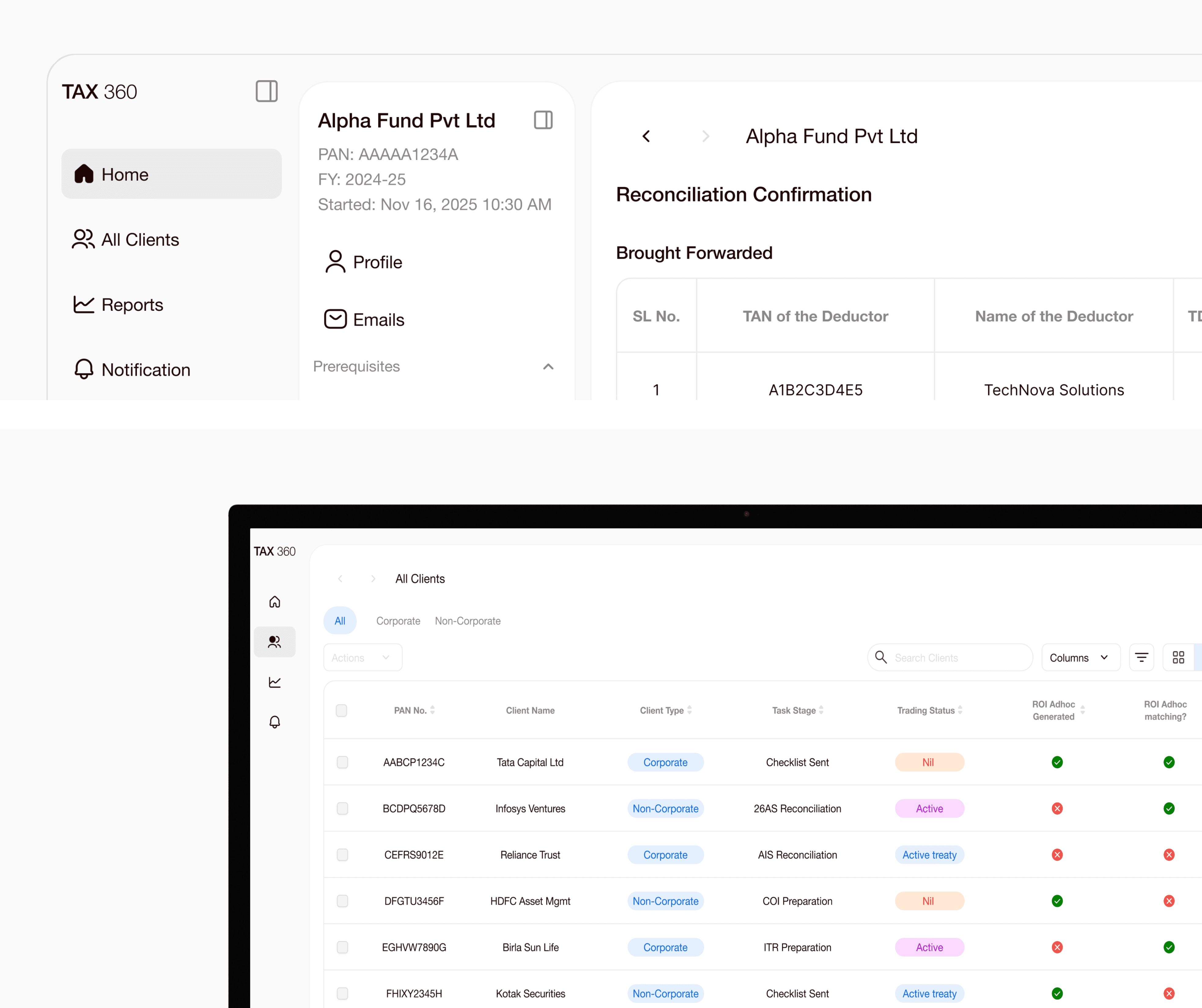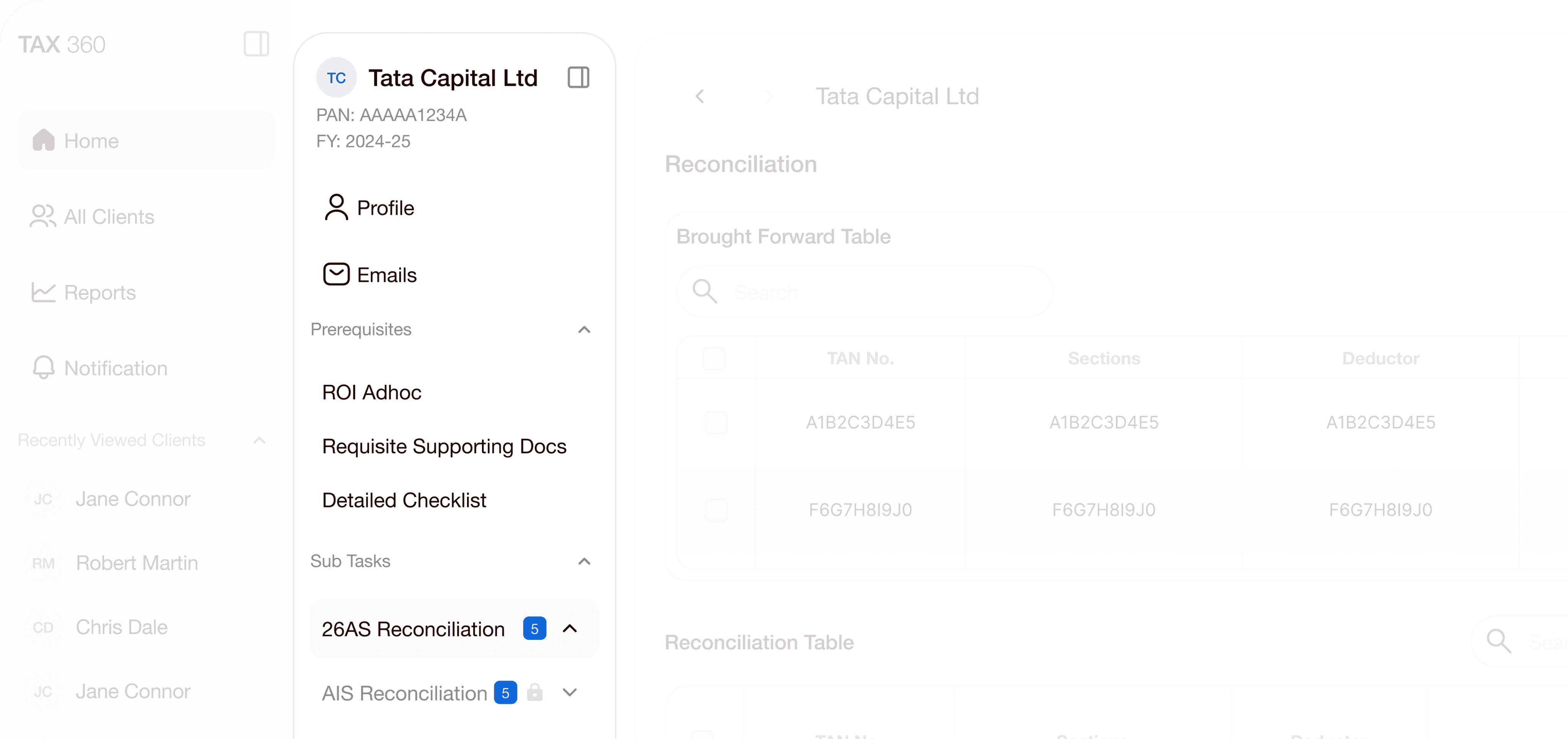 A clear client wise navigation so that the user is not lost in the process, each client have all the steps listed which needs to be completed for successful tax filing
